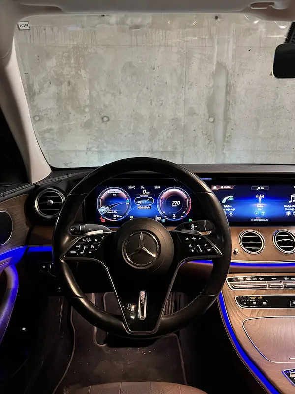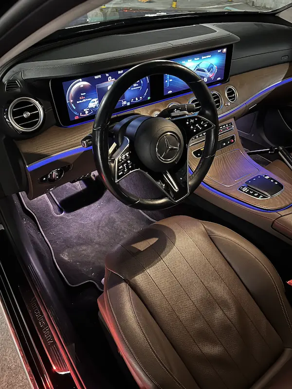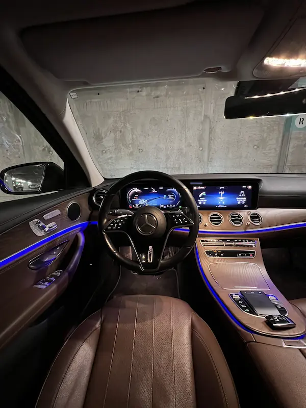 فضای داخلی مرسدس E200 با تودوزی چرم باکیفیت، نورپردازی محیطی چندرنگ، سیستم تهویه هوای چندمنطقهای و صندلیهای برقی با گرمکن و تهویه، تجربهای بینقص از رفاه و راحتی را ارائه میدهد. نمایشگر دیجیتال عریض، سیستم صوتی Burmester با صدای فراگیر، شارژر وایرلس، سانروف پانورامیک و امکانات ایمنی پیشرفته، رانندگی با این خودرو را همزمان به یک لذت و یک آسودگی خاطر تبدیل میکند. مرسدس E200، گزینهای ایدهآل برای کسانی است که به دنبال کیفیت، پرستیژ و آرامش در سفر خود هستند.